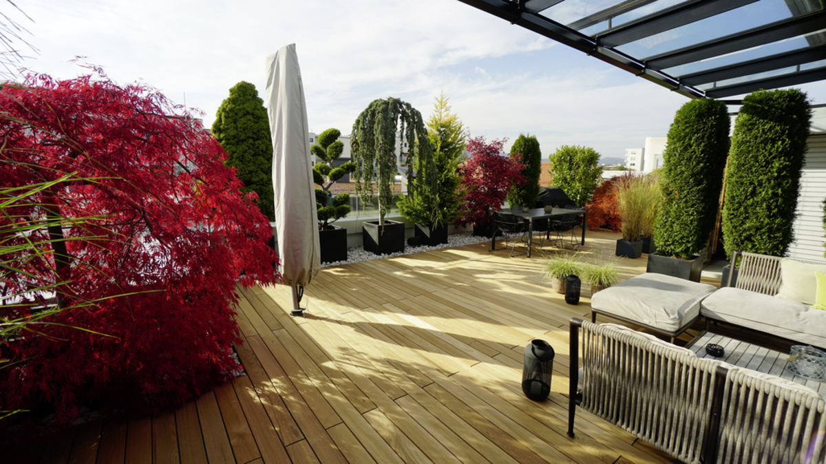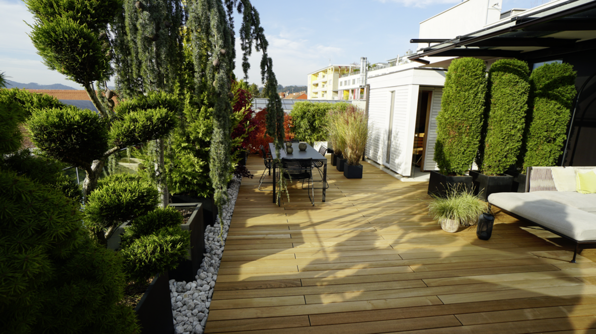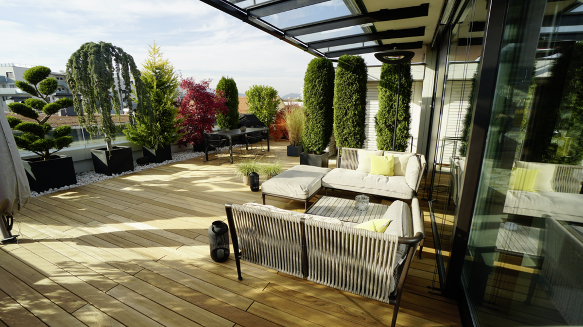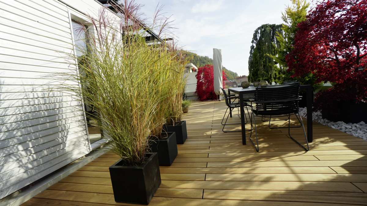 Na samo nekoliko koraka od užurbanog centra grada, vlasnici su ostvarili svoj san o životu iz ptičje perspektive. Krovna terasa od fine tikovine upotpunjuje dom oazom blagostanja koja obećava čisto opuštanje. Zahvaljujući sistemu polaganja i odgovarajućoj podkonstrukciji, daske su brzo i profesionalno postavljene, stvarajući tako osnovni preduslov za dugotrajno uživanje na terasi. Savršeno savetovana i obezbeđena od strane JAF Zengerera u Gracu, terasa će obezbediti mnogo više opuštajućih sati na uzvišenim visinama.
